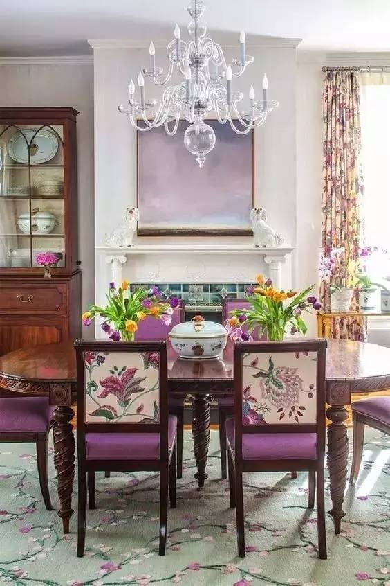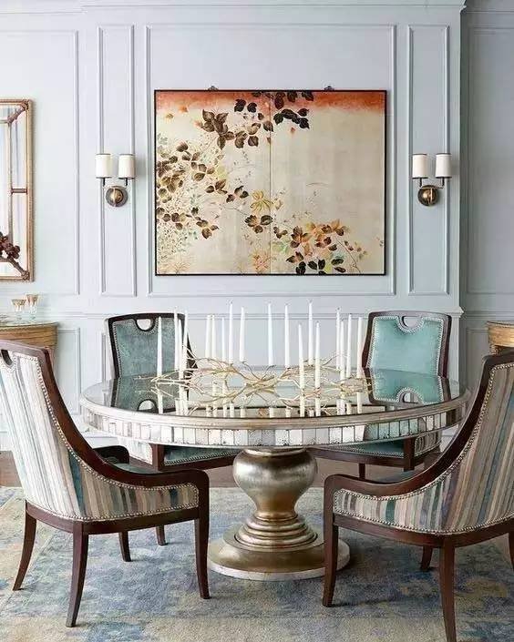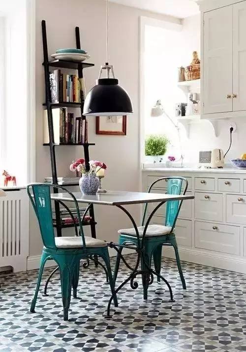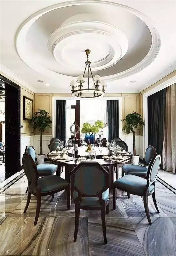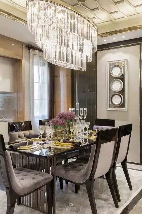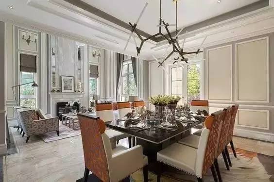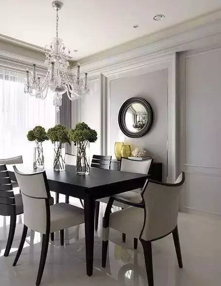 美式古典在另一个层面又突出了简单实用、随意自然的特点。餐厅设计方面,可选择色彩淡雅,线条简单的装饰,比如灰底白花的墙纸,交错拼接的棕黄色地砖,还有一套轮廓清晰简洁的餐桌套装。