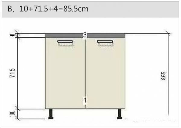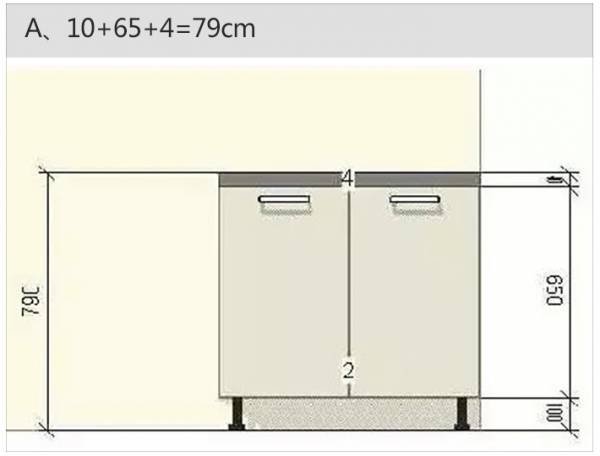 调整脚高度为10cm,台面高度4cm,柜体高度65cm,略高一些为71.5cm;