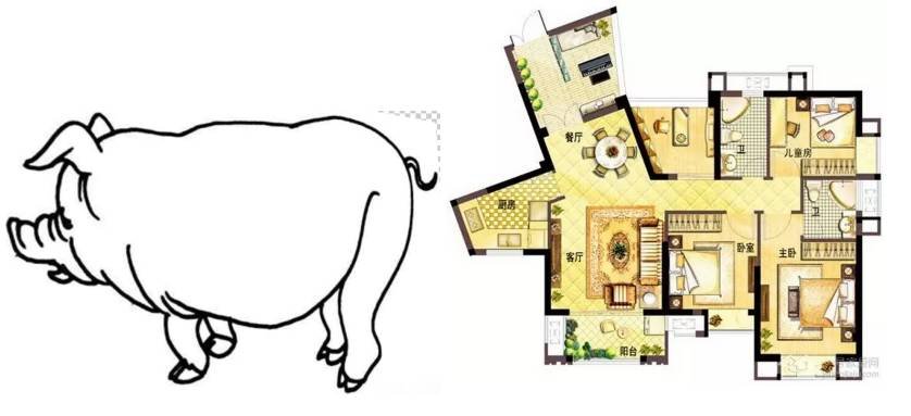 暂时忽略内部设置,只粗看这户型轮廓,像不像一只猪大哥站立的剪影?耳朵、鼻子,甚至尾巴都备齐了……