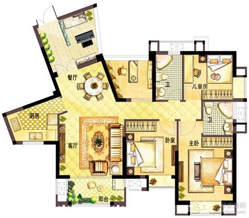 三角形户型是指户型整体呈现三角形状的户型,相对于缺角的户型,这种户型在实际中并不常见。