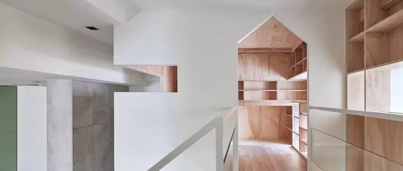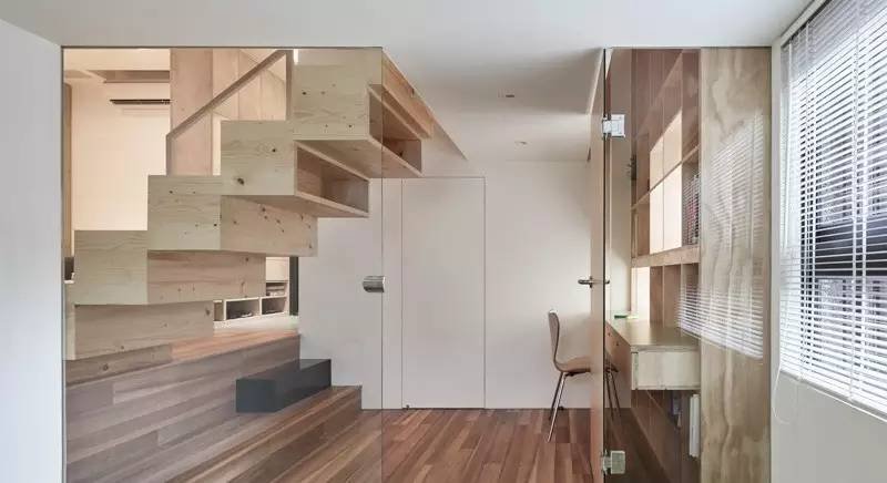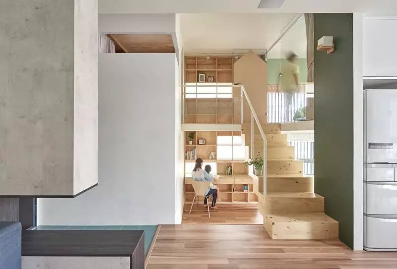 ▲这个空间预留了一个下沉式空间,让整体的空间结构呈现上、中、下的结构(上是卧室、衣帽间;中是客厅、餐厨空间;下是卫生间、工作区、榻榻米)。工作区及楼上书架不是完全封闭的,通透材质可将自然光引入室内。