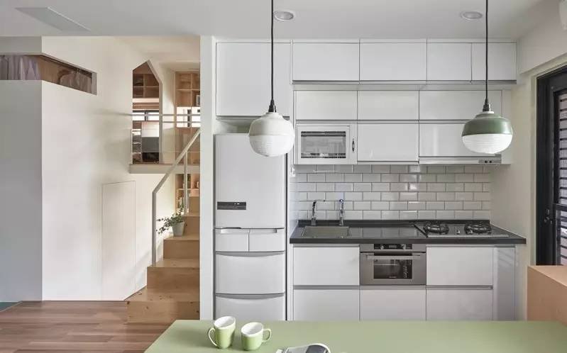 ▲厨房是纯白的现代厨房设计,橱柜也是规矩的柜式排放,与对面的柜体相得益彰。餐桌上方的吊灯,一绿一白与厨房与餐桌的色彩呼应。