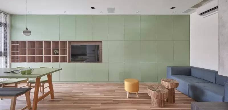 ▲这是一个青绿色+原木的清新空间,给人最大的直观感受是简约、环保、整洁,有楼梯大概是一个复式的结构。