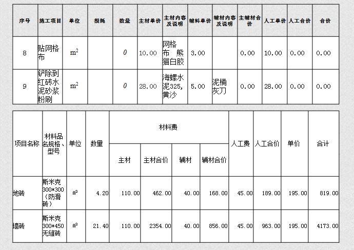 监理提醒:业主频跑市场对主材研究比较详细,对辅料价格就不清楚了,装潢公司就在此做文章。比如这里的拆除砖墙,本身人工费已经偏高了,辅料一项是根本不存在的。