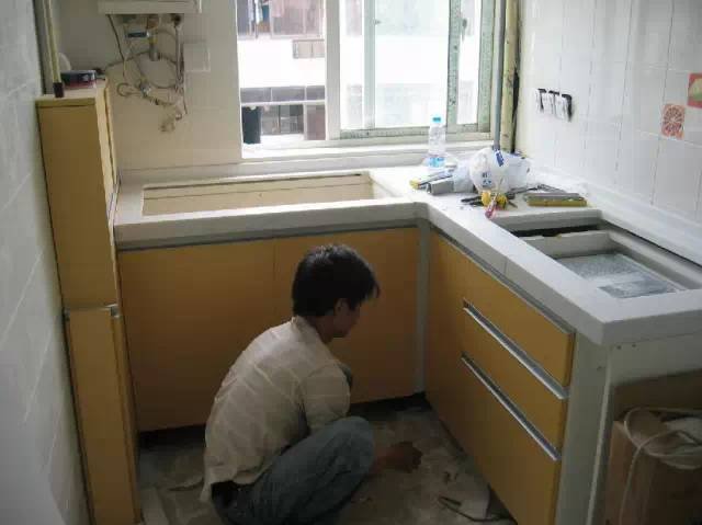 橱柜安装吊顶结束后,可以约橱柜上门安装了。顺利的话,一天的时间可以完成。同时安装的还有水槽(可以不包括上下水件)和煤气灶,橱柜安装之前最好协调物业把煤气通了,因为煤气灶装好之后需要试气。